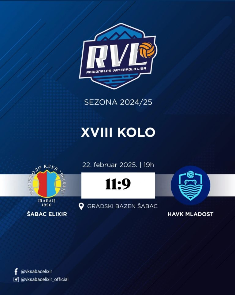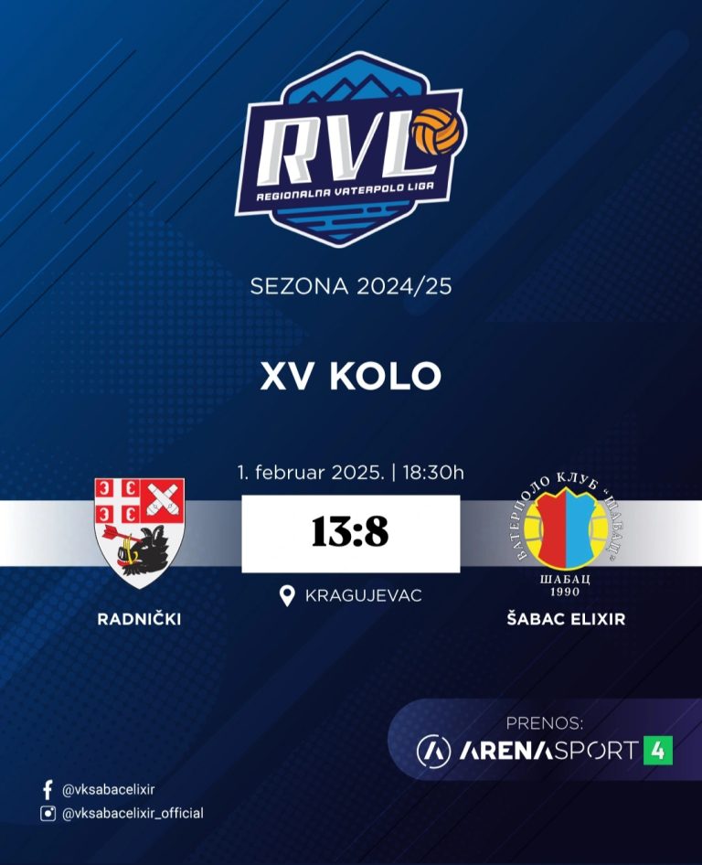 Vaterpolisti Šabac Elixira pretrpeli su večeras poraz od ekipe Radnički rezultatom 13:8. Domaćini su imali
